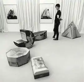 Ego Geometria Sum is an artwork created by British artist, Helen Chadwick between 1982 and 1983.[1] The work consisted of ten geometric plywood structures, in the shape of objects associated with Chadwick's past. Black and white naked photographs of the artist as well as locations associated with the objects were printed on the surface of the objects. The objects represent the mass of the artist's body at a progression of ages, from premature birth to maturity at age 30.[2] These objects include a 'Incubator - birth', 'Font - 3 months', 'Pram - 10 months', 'Boat - 2 years', 'Wigwam - 5 years', 'Bed - 6 3/4 years', 'Piano - 9 years', 'Horse - 11 years', 'High School - 13 years' and 'Statue - 15–30 years'.[3] Chadwick chose to not show her face in any of the images on the structures to allow a universality to the work even though it is heavily autobiographical, Chadwick wanted to find universal laws within the chaos of an individual life.[2]