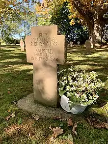 Recent research by historian Norman Fortier suggests that Mayer was shot down by Lieutenant Walter Gresham of the 358th Fighter Squadron of the 355th Fighter Wing. The claim is based on gun camera footage and recollections of Mayer's wingman, who was forced to bail out during the action.[38] Mayer was buried at the cemetery of Beaumont-le-Roger, France, and in 1955 re-interred at Saint-Désir-de-Lisieux German war cemetery near Lisieux, Normandy, France.[39]