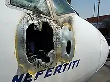 ![]() The melted nose of EgyptAir's Boeing 777 Nefertiti after the fire | |