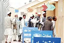 Afghans wait in line outside of the Egyptian Field Hospital at Bagram Airfield