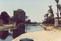 The Ismailia canal has its inlet at Cairo upstream of the Delta Barrages. It actually used to have two inlets, one called the Kasr-el-Nil, in the heart of Cairo. This was the oldest, but it was abandoned later after the area got very urbanized. The other inlet, called Shobra, is situated 7 kilometers below in the now bustling Shobra district in northern Cairo. After leaving its inlet, the canal follows the edge of the desert until it reaches the little Wadi Tumilat, which it crosses and follows the north side, trending direct to the east as far as the town of Ismailia, where it discharges into Lake Timsah. A branch, which begins a little before Ismailia, stretches toward the south across the desert, following a line parallel to the maritime Suez canal and empties into the channel of the port of Suez.