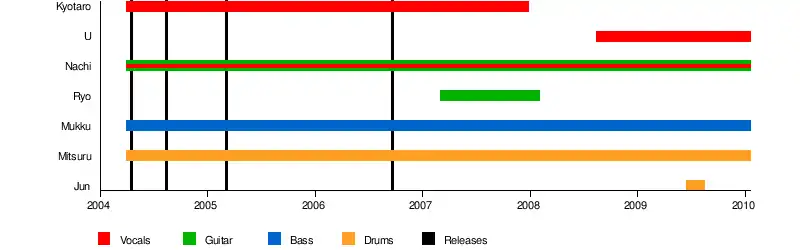 Shortly after vocalist Kyotaro's leave, guitarist Ryo also left the band. In August 2008, female vocalist U (ex-Low Head Machine) joined the band.[2] In June 2009, drummer Mitsuru temporarily left the band due to injuries.[3] THE EIGHT used a support drummer, Jun, until drummer Mitsuru returned in August 2009, the band's fifth anniversary.