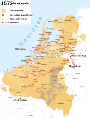Flushing and Veere defected to the rebels on 3 May.[19] Orange quickly responded to this new development, by sending a number of emissaries to Holland and Zeeland with commissions to take over local government on his behalf, in his old capacity of stadtholder, which he now re-assumed.[22] Diederik Sonoy persuaded the cities of Enkhuizen, Hoorn, Medemblik, Edam, Haarlem, and Alkmaar to defect to Orange. The cities of Oudewater, Gouda, Gorinchem, and Dordrecht yielded to Lumey. Leiden declared itself for Orange in a spontaneous revolt. The States of Holland, with a rebel majority,[note 2] convened in the rebel city of Dordrecht,[23] and by 18 July, only the important cities of Amsterdam (until 1578) and Schoonhoven openly remained loyalist. Rotterdam went to the rebels soon after the first meetings in Dordrecht. Delft remained neutral for the time being.[24] In Zeeland, the capital city of Middelburg also remained loyal, but was put under siege by the Geuzen from April 1572 until February 1574, when Middelburg surrendered to the rebels. Orange was recognised as stadtholder of Holland, Zeeland, and Utrecht at an unauthorised meeting of the States of Holland in Dordrecht in July 1572.[25] Orange also asked for a formal alliance between himself and the States of Holland, rather than just being the king's representative and the States being the people's representatives.[26] Calvinism was granted the status of 'public religion', even though less than 10% of the population was Calvinist at the time.[2]