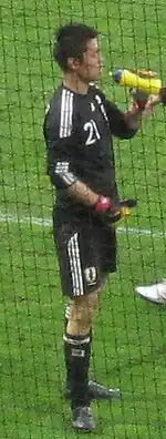 In May 2010, Kawashima was selected for the World Cup squad and was expected to serve as backup to Seigo Narazaki.[140] In a friendly match on 30 May against England, he was the starting goalkeeper and produced many saves. He denied Frank Lampard twice, including a penalty kick, and a shot by Wayne Rooney before eventually being beaten by two own goals.[141] Afterwards, it was announced that Kawashima was selected to be the first choice goalkeeper for the FIFA World Cup ahead of Narazaki.[142] He played his first Group E match against Cameroon on 14 June 2010, where Japan recorded its first World Cup win on foreign soil with a score of 1–0.[143] Five days later, on 19 June 2010 between against the Netherlands, Kawashima was the starter; he deflected a shot from Wesley Sneijder but it went in his own net as the team lost 0–1.[144] In the match against Denmark on 24 June he allowed one goal through Jon Dahl Tomasson's penalty kick, but the team still won 3–1 and advanced to the round of 16.[145] On 29 June, he allowed no goals against Paraguay but was unable to save a single spot-kick during the penalty shoot-out, which Paraguay won 5–3.[146]