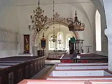 Internally, the church is richly decorated with medieval murals. The oldest (13th century) are found in the choir and depict imaginary animals, geometrical ornaments and foliage. The other paintings are from the middle of the 15th century and depict scenes from the Passion of Christ as well as other stories from the bible.[1]