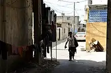 The camp covers a total area of approximately 1 square kilometer.[3] At its Northern side the camp borders the main roads at the entry to the Tyre peninsula and to its Eastern side the North-South Beirut-Naqoura Sea Road. Hence, it is severely affected by heavy traffic jams at the crossroads, especially during peak hours at the El Buss roundabout.[2] The camp has a number of entrances for pedestrians, but only one - on the South-Eastern side - for vehicles. Entry and exit there is controlled at a checkpoint by the Lebanese Armed Forces.[1] Foreign visitors have to present permits from Military Intelligence to them.[4]