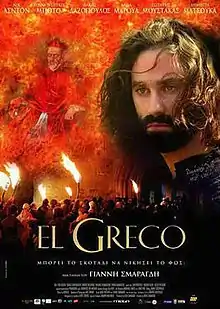 El Greco is a Greek biographical film about the life of the Greek painter of the Spanish Renaissance, Domenicos Theotokopoulos, known worldwide as El Greco. Based on the fictionalized biographical novel, El Greco: o Zografos tou Theou (El Greco: the Painter of God), by Dimitris Siatopoulos, it was released in 2007, directed by Yannis Smaragdis and written by Jackie Pavlenko. The main cast features prominent contemporary Greek actors like Lakis Lazopoulos, Dimitra Matsouka and Dina Konsta, and includes popular actors of the Greek cinema of the 1960s such as Sotiris Moustakas and Katerina Helmi, who, along with Juan Diego Botto, Laia Marull and others, surround the leading actor, Nick Ashdon, who portrays El Greco.