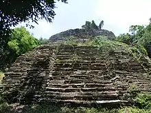The first plaza is marked by its northmost location and the sizable edifices which flank it, which are the largest within El Sabinito.[7] Outstanding among these constructions is the circular, eight-meter-high pyramid, with slabs of limestone jutting out of its sides like the arms of a windmill. This particularly conical style of pyramid has been associated with the worship of Ehecatl, the Huastec god of wind which was later appropriated by the Aztecs.[8] Opposite to this pyramid is a ceremonial altar measuring 2 meters by 6 meters with an aberrantly uneven shape.