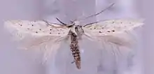 The wingspan is 8–9 millimetres (0.31–0.35 in).[2] The forewing ground colour is slightly glossy, creamy white, scattered with black scales and with three indistinct yellow longitudinal lines. The basal third of the costa is black. The hindwings are grey, with paler yellowish fringe scales.[3]