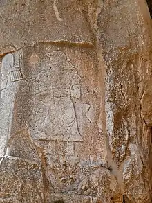 The Elamite rock relief in Naqsh-e Rostam is the oldest rock relief in Naqsh-e Rostam, belonging to the Elam culture. Bahram II, the Sasanian king, has destroyed this rock relief and carved his own relief on it. But small sections of the Elamite relief is still preserved. Scholars do not have consensus about the date of this relief. Ernst Herzfeld and Heidemarie Koch have suggested that the date of the relief is 4,000 years ago. However Alireza Shapour Shahbazi and Isa Behnam have suggested 1,200 BC as the date of this Elamite relief. The relief shows a god and a goddess seating on a throne. The legs of the throne are twisted with some snakes. On the right, there's a complete figure of a man with beard and long hairs. He has put his hands on his chest as a sign of respect to the god that once had existed in front of him, but now is completely destructed. On the left side, there's a figure of a woman with crown. It is believed that these man and woman are king and queen respectively and are worshiping the god and goddess. Small sections of God and Goddess figures are still visible, but can't be recognized duo to the destruction.