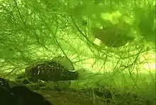 The bluebarred pygmy sunfish, Elassoma okatie, is a species of pygmy sunfish endemic to South Carolina, United States, where it prefers waters with dense vegetation growth in the Edisto and Savannah River drainages. This species can reach 3.4 cm (1.3 in) in total length.[2]