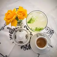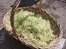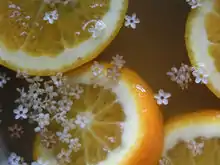 Elderflower cordial can be made relatively easily at home, though it is also produced and sold commercially. The flowerheads are best collected fresh and new when the tiny buds have just opened and come to bloom before the fragrance is tainted with bitterness.[1] The cordial is made by steeping the elderflower heads in a concentrated sugar solution so the flavour is infused into the syrup. A source of citric acid and lemon juice is added to help preserve the cordial and add tartness. The mixture is then covered and left to infuse before being strained to release as much juice as possible. For drinking the cordial is typically diluted with either water or sparkling water though tonic, soda or gin are also used.[1]