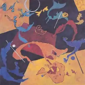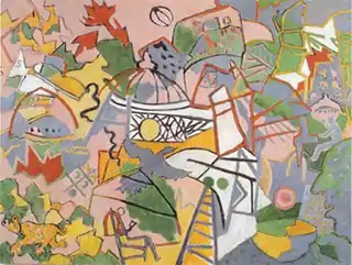 Himmelfarb's painting ranges along a continuum between stylized representation and abstraction that is nonetheless rooted in objective sources, such as the landscape, human figure, and architectural forms.[30][5][19] Critics position her work in the modernist tradition of Picasso, Miró, Matisse and Hans Hofmann in terms of its commitment to formal structure and the play between figure and ground.[6][7][30] Dialogue editor John Brunetti links her to contemporaries such as second-generation Abstract Expressionists Grace Hartigan and George McNeil, noting in their shared use of bold color, painterly surfaces and spatial ambiguity an interest in exploring "the metaphorical potential of the figure and landscape as seen through Modernism's distortions."[5] Himmelfarb has said, "Ideas are the basis of my paintings. Subject matter enters, not as something to be represented, but as an instrument for conveying an idea." She described her expressive tools as the "interplay of opposites—abstraction with representation, organic with geometric, floating forms against those that are static, [and] color that moves around the canvas."[11][31]