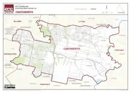 Unusually for a suburban seat, the district of Chatsworth is not named after a suburb within its boundaries but is instead named after Chatsworth Road.[2] This is despite the fact Chatsworth Road does not fall within the present district of Chatsworth; it runs through the neighbouring district of Greenslopes.[3]
