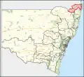 The electoral district includes all of the City of Lismore (including Lismore, Lindendale, Nimbin, Dunoon and Clunes), much of inland Tweed Shire (including Murwillumbah, Tyalgum and Uki), all of Kyogle Council (including Kyogle, Bonalbo, Tabulam and Woodenbong) and all of Tenterfield Shire.[1] (including Tenterfield, Drake, Jennings, Liston, Legume, Torrington and Urbenville)