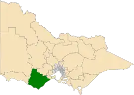 The electoral district of Polwarth is an electoral district of the Victorian Legislative Assembly. It is located in south-west rural Victoria, west of Geelong, and covers the Colac and Corangamite local government areas (LGA), parts of the Moyne, Golden Plains and Surf Coast LGAs, and slivers of the Ararat and Greater Geelong LGAs, running along the Great Ocean Road taking in Anglesea, Cape Otway, Peterborough, Aireys Inlet, Lorne, Wye River, Apollo Bay and Port Campbell, covering the inland towns of Winchelsea, Colac, Camperdown and Terang along the Princes Highway, and Inverleigh, Cressy, Lismore and Mortlake on the Hamilton Highway, and finally, includes the Otway Ranges and Lake Corangamite.[1]