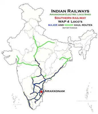 Being one of the three electric engine sheds in Southern Railway, various major and minor maintenance schedules of electric locomotives are carried out here. It has the sanctioned capacity of 150 engine units. This shed houses a total of 184 engine units, including 90 WAP-4, 91 WAG-5.[5] and 3 WAG-9 Electric loco Shed, Erode is now housing the 2nd largest fleet of WAP-4 in Indian Railways and it caters to many long-distance electric trains.[6][7]