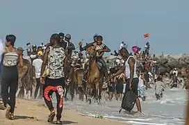 Elegushi Beach is a private beach located at Lekki, Lagos state, southwest Nigeria.[1] The beach is owned by the Elegushi royal family in Lekki, Lagos state.[2][3] Elegushi private beach is seen as one of the best beaches in Lagos and Nigeria at large. The beach entertains close to 40,000 guests every week with Sundays being the best day on the beach. Over half of all guests that are entertained on the beach weekly visit on Sundays. Their gate pass is at 2000 naira flat rate but can be discounted if you have like a group.[4] Their official IG handle can be used to reach them.