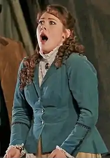 Beginning in 2009, she has performed regularly at the Stanislavski and Nemirovich-Danchenko Theatre in Moscow, in roles such as Puccini's Mimì in La bohème and the title role of Madama Butterfly, Tatjana in Tchaikovsky's Eugene Onegin, Leonora in Verdi's La forza del destino,[3][4] Elvira in Mozart's Don Giovanni, Micaela in Bizet's Carmen, Antonia in Offenbach's Les contes d'Hoffmann, Emma in Mussorgsky's Khovanshchina[3][5] and Natasha in Prokofiev's War and Peace.[2] She appeared as a guest at the Staatstheater Saarbrücken as Jaroslawna in Borodin's Prince Igor[3] and the Deutsche Oper Berlin as Mimi. She appeared at the Théâtre du Capitole in Toulouse as Gerhilde in Wagner's Die Walküre, at the Theater Basel as Polina in Prokofiev's Der Spieler, the Hamburg State Opera and Opéra National de Lyon, adding roles such as Verdi's Aida and Desdemona, and Puccini's Tosca to her repertoire.[5] She performed at international festivals, as Lisa in Tchaikovsky's Pique Dame at the Savonlinna Opera Festival, and as Nastasja in Tchaikovsky's Die Zauberin at the Festival Vie et Destins in Lyon.[3]