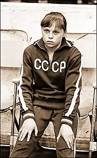 Elena Vyacheslavovna Mukhina (Russian: Елена Вячеславовна Мухина; first name sometimes rendered "Yelena", last name sometimes rendered "Muchina"; 1 June 1960 – 22 December 2006) was a Soviet gymnast who won the all-around title at the 1978 World Championships in Strasbourg, France. Her career was on the rise, and she was widely touted as the next great gymnastics star until 1979, when she broke a leg and missed several competitions. The rushed recovery from that injury, combined with pressure to master a dangerous and difficult tumbling move (the Thomas salto) caused her to break her neck two weeks before the opening of the 1980 Summer Olympics, leaving her permanently quadriplegic.