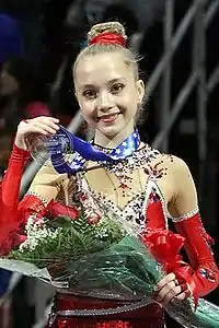 Radionova won the bronze medal at the 2014 Russian Championships after placing third in both the short and long program. Though an injury caused her to miss the Russian junior nationals, she was later added to the Russian team for the 2014 World Junior Championships.[12] At the event, Radionova became the first ladies' single skater to repeat as World Junior champion. Scoring 66.90 points in the short program, 127.39 in the free skate, and 194.29 for the combined total, she broke junior-level ladies' records previously held by Mirai Nagasu and Yulia Lipnitskaya.[13] Radionova, Serafima Sakhanovich, and Evgenia Medvedeva produced Russia's second consecutive sweep of the World Junior ladies' podium. During the off-season, Radionova performed in various Russian cities with Show of the Champions and in Korea with Igor Bobrin's Theatre on Ice.[14]