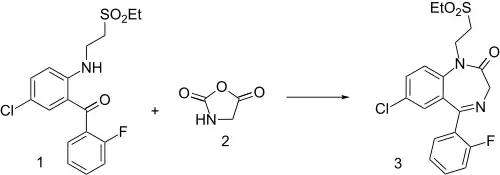 Benzophenone derivative 1 is reacted with a glycine equivalent masked as an oxazolidine-2,5-dione 2 to give the final product 3 Elfazepam.