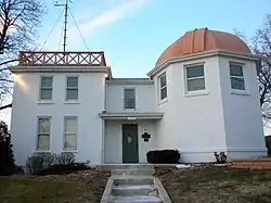 The Elgin National Watch Company Observatory is on the northeast corner of Watch and Raymond Streets, two blocks east from where the factory once stood. It was constructed on a gravel base, which could absorb surface vibrations. Concrete piers were dug 60 feet (18 m) down into this layer to secure the telescope and Riefler clocks. The two-story building can be split into three segments: the entrance, the observatory, and the office. The entrance segment connects the other two segments. The walls are made of lath and plaster and the room features a lavatory. The second floor above the entrance is the chronograph room, with one of the two Riefler clocks on a pier. A switchboard in this room directed signals from the observatory to the offices in Chicago. The south wall features a double-hung window. Also to the south is a Warner & Swasey chronograph, used to record the star observations. Also found in the chronograph room were the two auxiliary clocks to the master clocks. These too were Rieflers. One was No. 237 and the other was No. 240. Both clocks are no longer present in the building.[2]