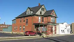 Eli Hoover House and Confectionery is a historic home and confectionery located at Muncie, Delaware County, Indiana. The house was built in 1899, and is a 2+1⁄2-story, Queen Anne style red brick dwelling with limestone detailing.[2] It has a multiple gable roof, corner entrance, and slate fishscale shingles on the gable ends. It was originally built for residential and commercial purposes.[3]: 80–81