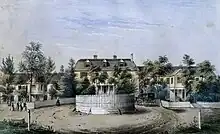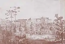Marks selected a location with over 500 acres two miles outside of Columbia for his new school and named it "Barhamville" after his deceased first wife Jane. The spot was selected because the sandhills there were considered healthier than downtown Columbia and it was distant from the distractions of the town. "The house was situated on an elevated knoll in the pine woods, surrounded by a beautiful drive and gardens in a state of high cultivation."[33] The main building had a three-story center structure with a cellar and wings off to each side. The North wing was made of wood, three stories high with a basement of brick. The South wing was all brick and two stories high with a cellar.[34] There were stand-alone structures for the chemistry lab, teacher housing, and the like. Marks and his wife lived in the central building, which had an entrance hall complete with African American butler and "a broad, circular stairway with mahogany balustrades."[20] The student dormitories and classrooms were in the wings.