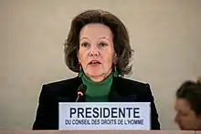 Tichy-Fisslberger was elected chair of the United Nations Human Rights Council in December 2019 to serve in 2020.[2] The Austrian Minister of Foreign Affairs, Alexander Schallenberg, noted that her appointment was a recognition of her country's human rights efforts. She was the first Austrian to hold this position in the United Nations.[3] She took over the position from Coly Seck of Senegal who had held the position in 2019.[4] Her vice-presidents were Ambassadors Nasir Ahmad Andisha of Afghanistan, Togo's Yackoley Kokou Johnson, Mexico's Socorro Flores Liera and Slovakia's Juraj Podhorsky.[4]