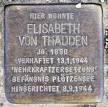 Elisabeth Adelheid Hildegard von Thadden (29 July 1890 – 8 September 1944, executed) was a German progressive educator and a resistance fighter against the Nazi régime as a member of the Solf Circle. She was sentenced to death for conspiring to commit high treason and undermining the fighting forces (Wehrkraftzersetzung).