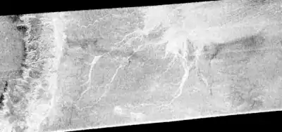 Elivagar Flumina is a network of river channels ranging from 23 km to 210 km in length[1] in the region around the Menrva Crater of Titan.[2] The channel system is at least 120 km wide and shows signs of erosion. At its mouth, an alluvial fan is present.[3] The Elivagar Flumina is interpreted as alluvial due to its closeness to fluvial valleys and as understood from the radar backscatter.[4] Geomorphologic mapping of the Menrva region of Titan has yielded evidence for exogenic processes such as hydrocarbon fluid channelization (in other words flash floods) that are thought to have formed the Flumina network.[2][5]