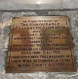 In the reply to Conder's presentation, a Bro. Rylands indicated that "there was no evidence forthcoming" that Aldworth served as Master of a Lodge, or that she regularly attended.[4] Elizabeth Aldworth died in 1775. There was a plaque erected at the new St. Finbarre's Cathedral by the Masons of Cork, which reads: