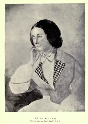 She was a dear friend of the Italian nationalist Giuseppe Mazzini until her early death.[10][11] Mazzini and the Ashurst family grew close, and Mazzini considered himself part of the Ashurst family, calling the Ashurst daughters "sister".[12] Eliza, though, may have wished to have been more than a loving sister.[13][nb 1] His letters to her are reprinted in E. F. Richards' collection: Mazzini's Letters to an English Family.[16]