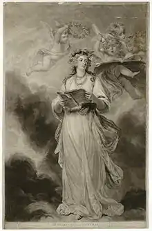 In person Mrs. Billington was very handsome, though inclined to stoutness. Her portrait was painted by Sir Joshua Reynolds as Saint Cecilia, and has been engraved by James Ward, Pastorini, and Cardon. The exhibition of old masters at Burlington House in 1885 contained a small portrait by Reynolds, said to be of Mrs. Billington in her youth, a statement which is probably inaccurate. Two miniatures of her were painted, one by Daniel, and there are engravings of her by T. Burke after De Koster, as Mandane by Heath after Stothard, by Bartolozzi after Cosway, by Dunkarton after Downman, and by Assen. A portrait of Clara in the 'Duenna,' painted and engraved by J. R. Smith in 1797, probably represents Mrs. Billington.[4] Haydn said of her, that Sir Joshua Reynolds should rather have painted the angels listening to Mrs Billington singing, than have depicted, as he did, Mrs Billington listening to the angels.