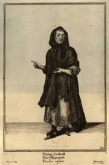 Elizabeth Cresswell was born in about 1625, probably in the small village of Knockholt in Kent, England.[1] Her middle-class Protestant family were influential, with strong connections to the powerful Percival family, favoured by King Charles I.[2] By July 1658 Cresswell is recorded as a bawd "without rival in her wickedness", running a brothel in Bartholomew Close, a small street off Little Britain in the City of London.[1] That month she was brought to trial in Hicks Hall, where constable John Marshall gave evidence that "Elizabeth Cresswell living in Bartholomew Close was found with divers Gentlemen and Women in her House at divers times". Marshall notes that some of the women were "sent to Bridewell", a notorious London prison.[3][lower-alpha 1] She subsequently attempted to bribe the police to avoid publicity for the court case. She was living two miles to the northeast of Bartholomew Close in St Leonard's, Shoreditch, by October 1658,[1] when a mass of angry locals gathered at Westminster Court to give evidence against her and the prostitutes she ran from her "house". They stated that she:
