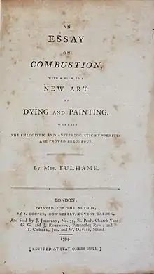 {{cite book}}: CS1 maint: multiple names: authors list (link) - 1 2 3 Fulhame, Elizabeth (1794). An essay on combustion, with a view to a new art of dying and painting. Wherein the phlogistic and antiphlogistic hypotheses are proven erroneous. London: Printed for the author, by J. Cooper. Retrieved 2 March 2016.|