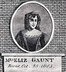 Gaunt was an Anabaptist shop-keeper in London.[1] She and her husband William lived in the parish of St Mary, Whitechapel. They were involved in Whig politics.[2] She was the daughter of Anthony Fothergill of Brownber, Ravenstonedale, and was well known to give shelter to persecuted people, such as victims of religious and political oppression.[1] According to Bishop Burnet, she spent "her life in acts of charity, visiting the gaols and looking after the poor of what persuasion soever they were". She helped one of the participants of the failed Rye House Plot of 1683, James Burton, to escape to Amsterdam. After his arrest in 1685, Burton implicated her as an accomplice in the hope of saving his life. She was in fact not involved in the conspiracy and the trial against her was seen as a show trial. David Hume wrote, "He received a pardon as a recompense for his treachery and she was burnt alive for her charity."[3] She was sentenced to death for treason in the Old Bailey on 19 October 1685.