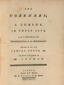 - ↑ Foote, Samuel (1778). The Cozeners: A Comedy, of Three Acts, as it was Performed at the Theatre-Royal in the Hay-Market. T. Sherlock.