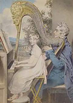 Randles spent a few days under the care of the Princess of Wales, at her summer home, the Pagoda in Blackheath. There, she spent time playing with a young Princess Charlotte of Wales,[6] To ensure that she had sufficient funds for her education, Randles, her father, and Parry toured the rest of the United Kingdom between 1805 until 1808.[7] In June 1808, she returned to London to perform at the Hanover Square Rooms, sponsored by the Prince of Wales and the Marchioness of Downshire.[3] Parry remained in London, whilst Randles and her father returned home. There she learned to play the harp and by the age of fourteen she was proficient in both instruments, as well as the organ.[1] She returned to London in 1818 to take harp lessons from François-Joseph Dizi and piano lessons from Friedrich Kalkbrenner.[1]
