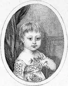 By the time Randles was three and a half, she was invited to play for King George III, Queen Charlotte, and other members of the Royal Family.[4] The recital was a success and the king presented Randles with 100 guineas (worth approximately £96,000 in 2014).[note 3][3] She created such a sensation that Caroline, Princess of Wales, wished to adopt her though her father would not allow it.[5][1] The publicity of the royal concert led to a subsequent breakfast concert for the public, with tickets costing 1 guinea each (approximately £960 in 2014).[note 4] The concert was held at Cumberland Gardens, with approximately 500 people "of first rank" attending. All profits of the breakfast, as well as donations by the attendees, were given to Randles in the form of various trusts.[1]