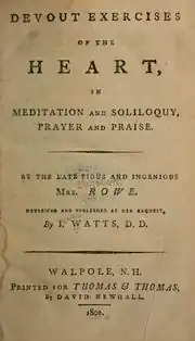 Devout Exercises of the Heart in Meditation and Soliloquy, Prayer and Praise (1737) Following her death and according to her wishes, Isaac Watts revised and published her religious meditations in this work.[29]