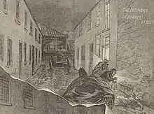 Following an argument on 26 September 1888, Stride and Kidney again separated, and she again took residence at 32 Flower and Dean Street (then a notorious slum and criminal rookery[43]), informing a fellow lodger named Catherine Lane she and Kidney "had had a few words".[42] Over the following days she regularly earned money by performing cleaning duties, both at the lodging house and for local residents, being observed by the housekeeper, Elizabeth Tanner, to be a quiet woman who occasionally performed cleaning work for the local Jewish community.[38][n 4]