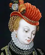 Charles V, king of Spain, Naples, and Sicily and Holy Roman Emperor, handed over the kingdom of Spain to his son Philip II and the Empire to his brother Ferdinand I in 1558, ending the domination of western Europe by a single court, but the Spanish taste for sombre richness of dress would dominate fashion for the remainder of the century.[1][2] New alliances and trading patterns arose as the divide between Catholic and Protestant countries became more pronounced. The severe, rigid fashions of the Spanish court were dominant everywhere except France and Italy. Black garments were worn for the most formal occasions. Black was difficult and expensive to dye, and seen as luxurious, if in an austere way. As well as Spanish courtiers, it appealed to wealthy middle-class Protestants. Regional styles were still distinct. The clothing was very intricate, elaborate and made with heavy fabrics such as velvet and raised silk, topped off with brightly coloured jewellery such as rubies, diamonds and pearls to contrast the black backdrop of the clothing.[3] Janet Arnold in her analysis of Queen Elizabeth's wardrobe records identifies French, Italian, Dutch, and Polish styles for bodices and sleeves, as well as Spanish.[4]