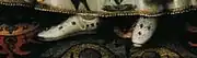 Fashionable shoes for men and women were similar, with a flat one-piece sole and rounded toes. Shoes were fastened with ribbons, laces or simply slipped on. Shoes and boots became narrower, followed the contours of the foot, and covered more of the foot, in some cases up to the ankle, than they had previously. As in the first half of the century, shoes were made from soft leather, velvet, or silk. In Spain, Italy, and Germany the slashing of shoes also persisted into the latter half of the century. In France however, slashing slowly went out of fashion and coloring the soles of footwear red began. Aside from slashing, shoes in this period could be adorned with all sorts of cord, quilting, and frills.[46] Thick-soled pattens were worn over delicate indoor shoes to protect them from the muck of the streets. A variant on the patten popular in Venice was the chopine – a platform-soled mule that raised the wearer sometimes as high as two feet off the ground.[47]