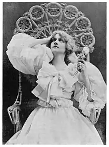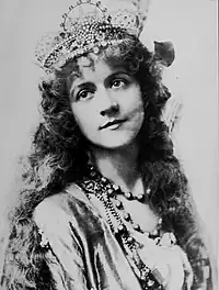 Yaw gave her first and only performance at the Metropolitan Opera House in New York on March 21, 1908. At the time, the Met was competing for singers and public support with Oscar Hammerstein's Manhattan Opera Company, which had been formed only two years earlier and, in spite of some initial skepticism from the New York musical establishment, had quickly become a formidable competitor, booking international stars such as Nellie Melba, Mary Garden, Lillian Nordica, and Alessandro Bonci, and programming new and rarely performed works such as Debussy's Pelléas et Mélisande and Offenbach's Tales of Hoffmann.[24] In one of his greatest coups, Hammerstein had secured a contract with soprano Luisa Tetrazzini, then at the peak of her fame and coming off a series of performances at Covent Garden in London, where she had been rapturously greeted as "the voice of the century".[25] Tetrazzini made her New York debut with the Manhattan Opera Company on January 21, 1908, and appeared in 21 further performances during the season.[26] Her association with his crosstown rival was particularly galling to Metropolitan director Heinrich Conried, who had tried to obtain Tetrazzini's services as early as 1904, but had failed when their negotiations devolved into recriminations and lawsuits.[27] When he heard that she had signed with Hammerstein, he sued again, unsuccessfully, to prevent her from performing.[28] It was at this point that Conried offered Ellen Beach Yaw, whose reputation as a vocal prodigy had already garnered great attention from the press, a chance to put on "a Tetrazzini-like show" at the Metropolitan.[29] The role was Lucia in Lucia di Lammermoor, which Tetrazzini was performing at the same time with Hammerstein's company.