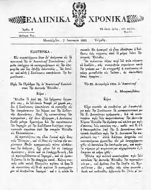 On December 18,[1] 1823, Mayer announced the newspaper's publication with a leaflet which also contained a Mayer's text and an extract of a Jeremy Bentham's essay about free press. On December 24, 1823, a special edition of Ellinika Chronika was printed and on January 1, 1824, its regular edition began. During 1824, 106 issues were published, followed by 105 in 1825, and further 15 from February 6 to February 20, 1826, when its print stopped.[2] The newspaper had distributors in many Greek cities and abroad. The annual subscription fee cost 6 Spanish thalers. One hundred papers of every edition were distributed free to the Greeks.