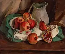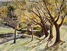 Several of her works, and a portrait of her by Dora Wilson which "captures Miss Roach's smile, and is a fascinating study in greens and browns," were on display at an Independent Group exhibition at the Athenaeum Gallery in Melbourne in September 1942.[36][37][38] A memorial solo exhibition of forty-three works was held 9–20 March 1943[39] from which three of her pieces, including two oil paintings and one watercolour, were acquired by the Castlemaine Art Museum. Despite the purchases made on the advice of Daryl Lindsay, James MacDonald, critic for The Age, ignored the memorial status of the show and delivered a withering review, writing that "these studies have a general monotony, owing to the absence from all of them of any personal conviction," and finding their "certain Cezanney cast...derivative and imitative."[40] By contrast, Harold Herbert in the Argus wrote that Roach was "an excellent and versatile painter...Her work was always simple and seen in a big way. She knew how to wield a full brush in water colour, and never failed to achieve a successful result."[41]