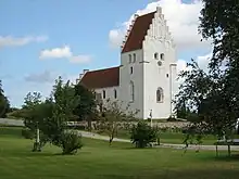Elmelunde Church, famous for its frescos, is located in the village of Elmelunde, Møn, in southeastern Denmark. It stands high above the surroundings just south of the main road from Stege to the white cliffs of Møn. The impressive whitewashed building can be seen from miles around and has been used as a landmark by sailors in the Baltic Sea.