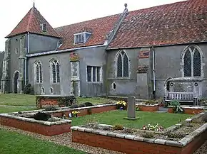 The Church of England parish church is dedicated to Saint Anne, the mother of the Virgin Mary and Saint Lawrence of Rome, a leader of the Early Church and a martyr. The main parts of the church have been dated to around 1310; a South Chapel was added about 20 years later. The early 14th-century tower only rises one and a half storeys and was never completed. The south wall of the chancel has a squint or "leper window";[3] these were popularly supposed to have been used by people infected by leprosy to receive Holy Communion; however, their exact purpose is unknown.[4] On the sill of East window, there is an oak effigy of knight in chainmail armour with a pointed bascinet helmet,[3] perhaps depicting Lawrence de Tany, who died in 1317.[5] The Church provides Sunday Services and a children's Sunday School, and is available for use as a wedding venue. The listed building is surrounded by a small cemetery.